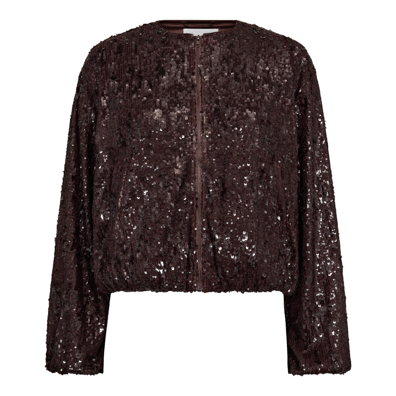 Het SophieCC Sequin Balloon Jacket is een echte eyecatcher. Dit jasje heeft een ballonvormige pasvorm en is volledig bezet met glinsterende pailletten in een diepe dark brown tint. De ronde hals en ritssluiting aan de voorkant geven het ontwerp een moderne, verfijnde uitstraling. Perfect om elke outfit een feestelijke touch te geven.