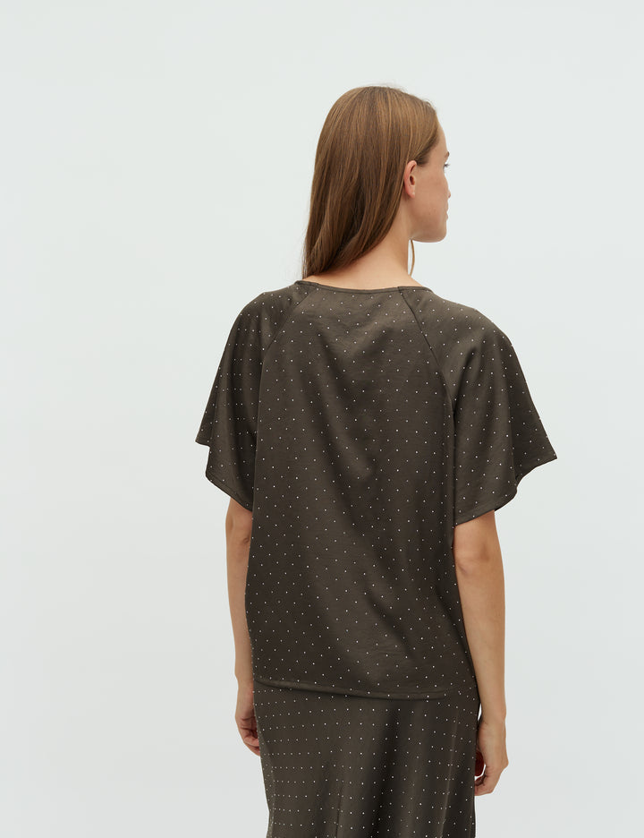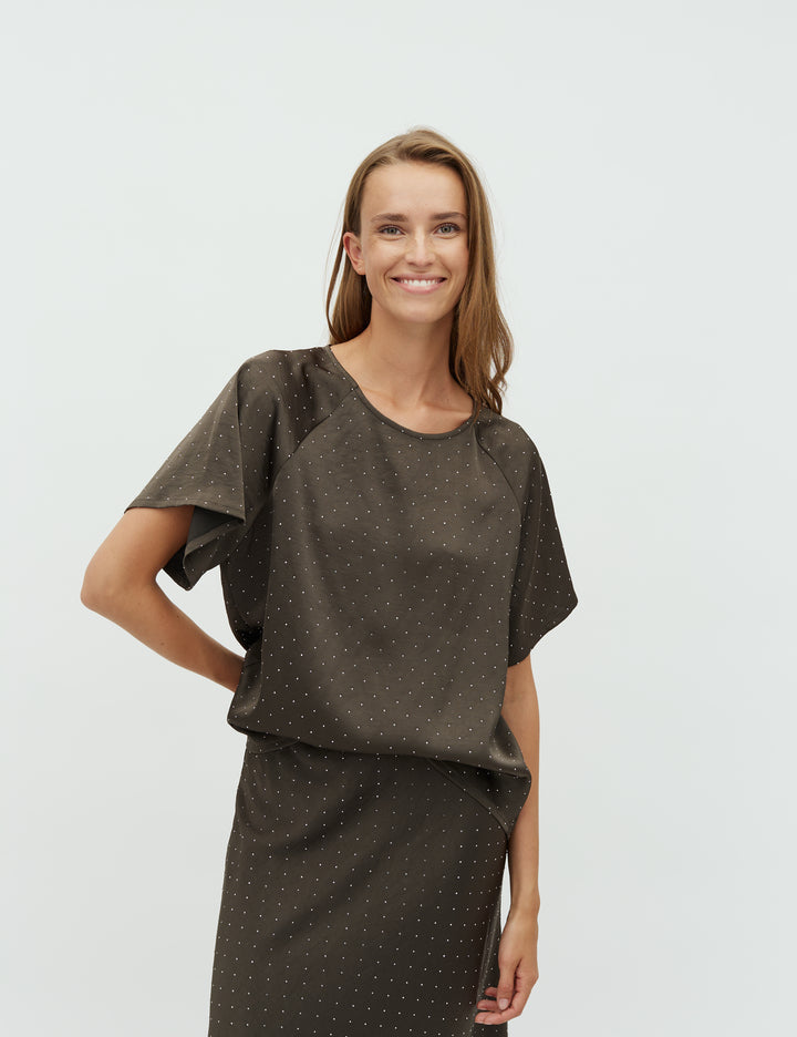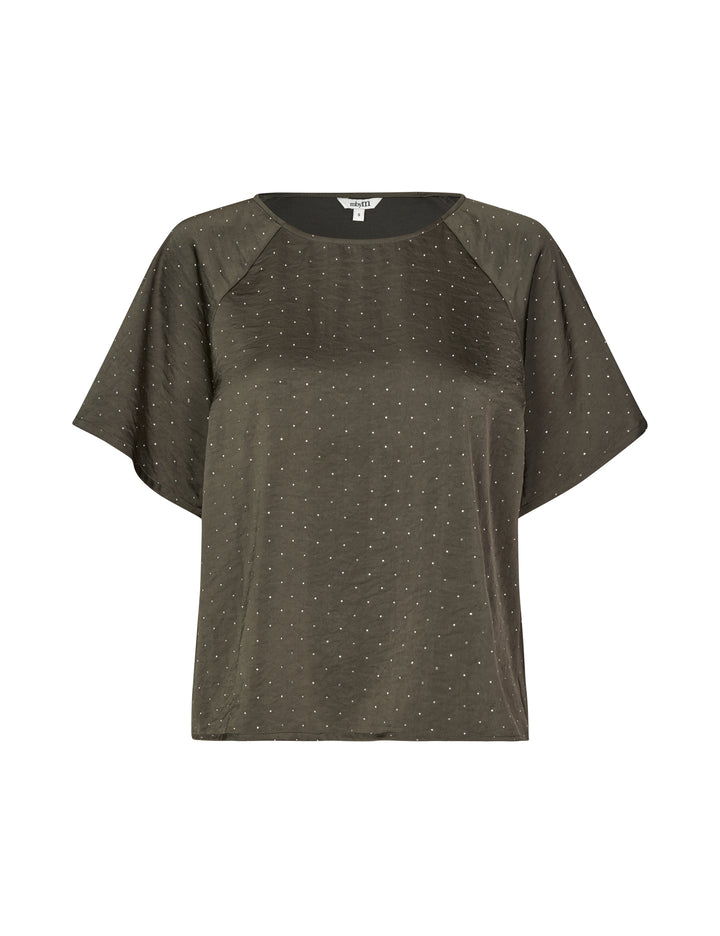 Deze satijnen top is gemaakt van 100% polyester en uitgevoerd in een donkergrijze kleur, verrijkt met glittersteentjes. Het losse model met korte mouwen en een ronde hals biedt een comfortabele pasvorm en een elegante uitstraling. Draag de top samen met de Asaka-M Pant voor een stijlvolle co-ord look die zowel casual als chic gedragen kan worden.