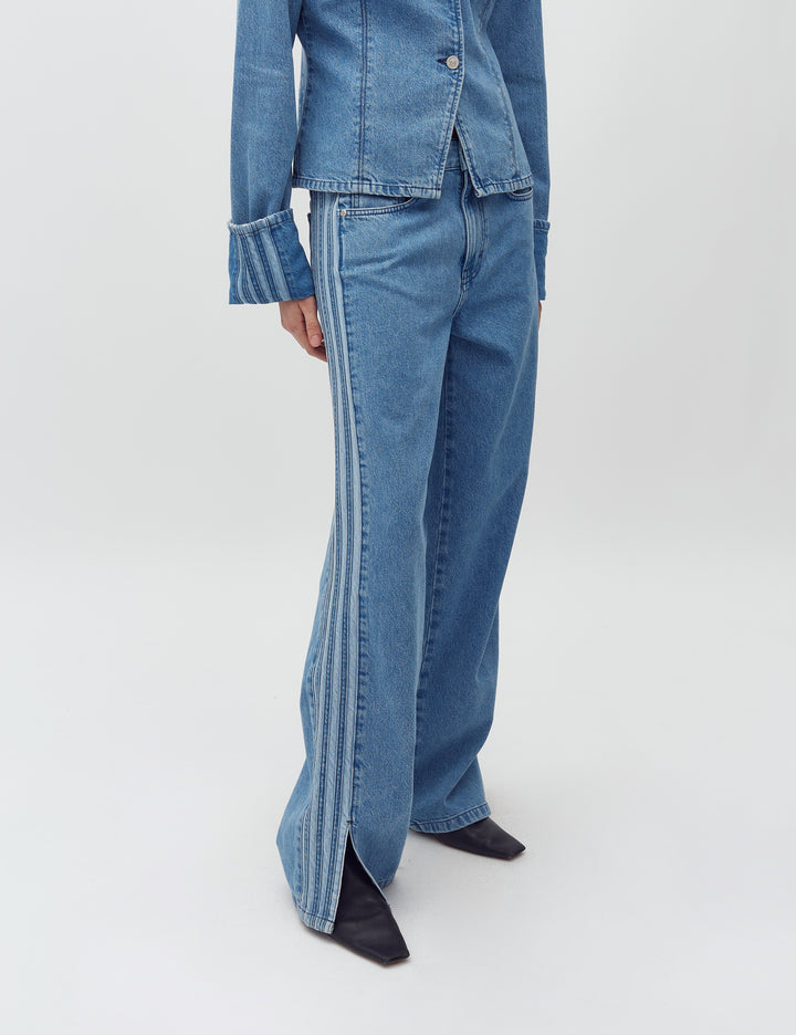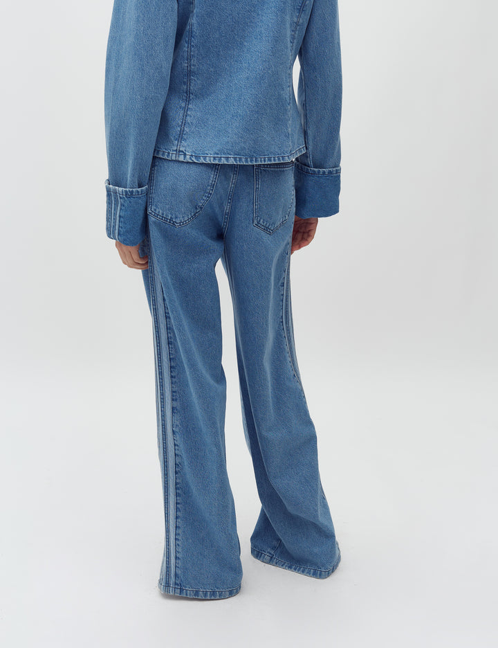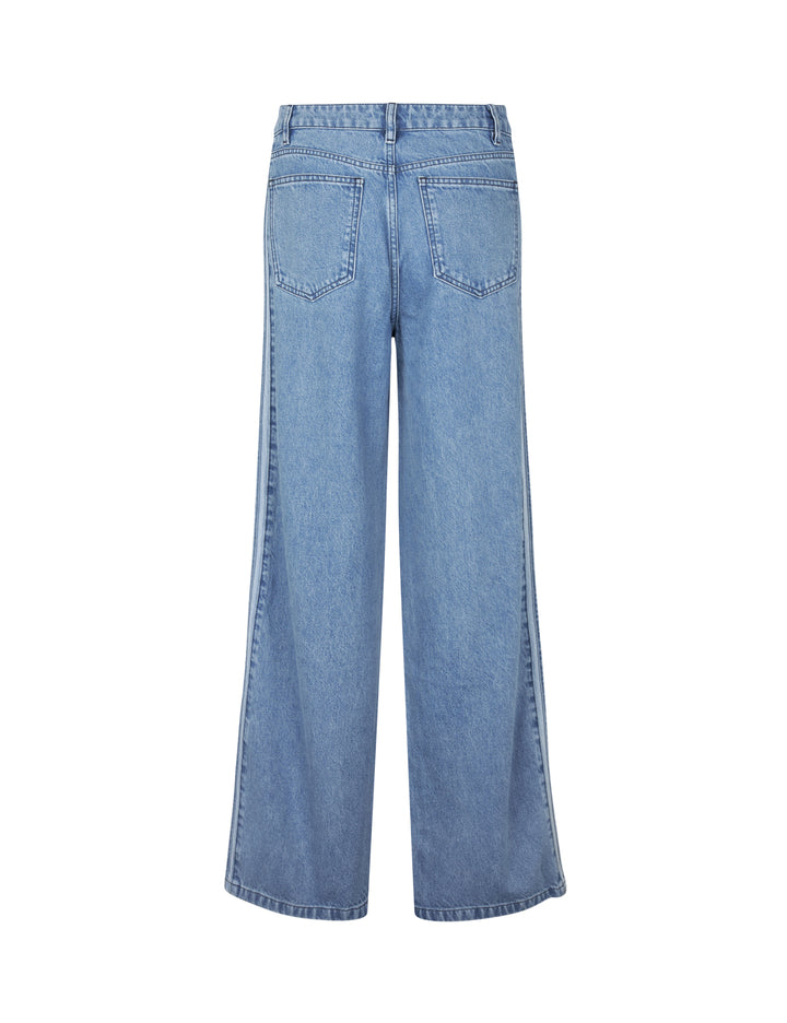 Het model is uitgevoerd in 100% katoen en heeft een rechte tot licht uitlopende pijp met strepen langs de zijkant voor extra karakter. Perfect te combineren met het bijpassende Wolina-M jasje voor een stijlvolle denim co-ord look.