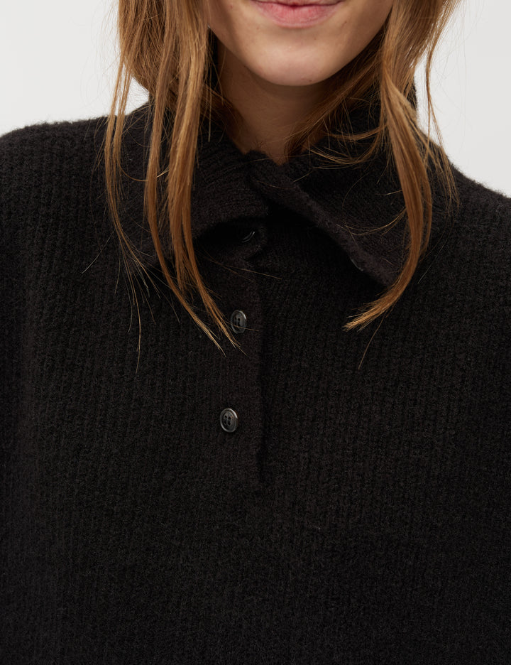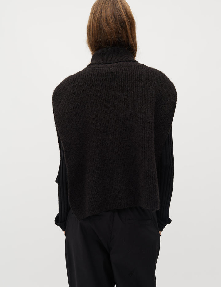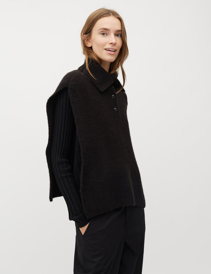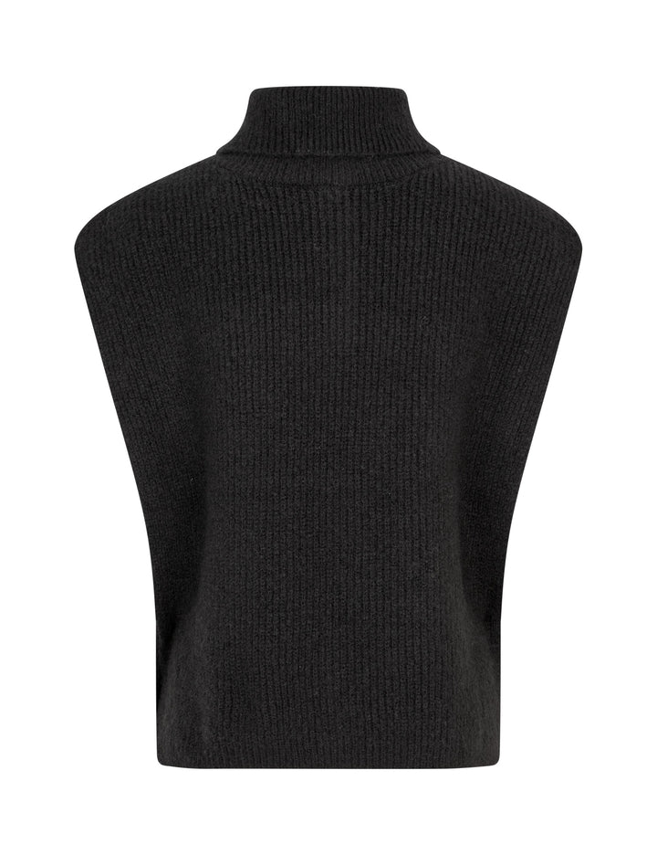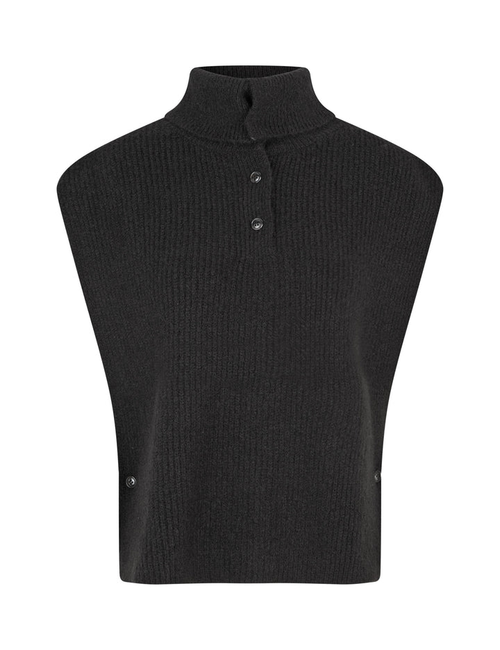 Comfortabel onesize vest met een hoge hals en knoopsluiting, uitgevoerd in een losse pasvorm met normale lengte. Het ribgebreide design is gemaakt van 68% acryl, 12% polyester, 11% nylon, 6% wol en 3% elastaan, waardoor het vest zacht, warm en licht elastisch is. Een veelzijdige knit die moeiteloos combineert met elke outfit. Kleur: Zwart