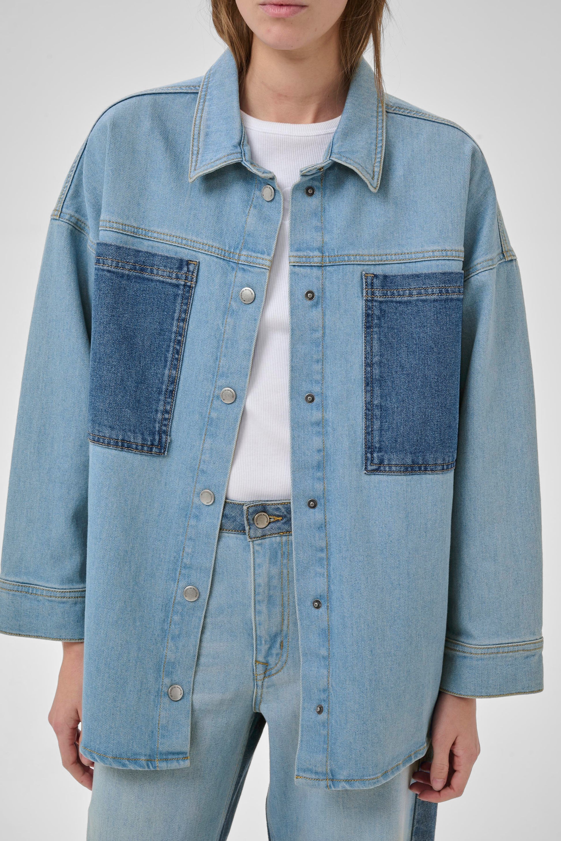 Het MWMazie 139 Boxy Mix Shirt is een moderne denim blouse met een boxy pasvorm en een eigentijdse uitstraling. Het ontwerp combineert een lichte denim met donkerdere borstzakken, wat zorgt voor een subtiel contrast en een speels detail.