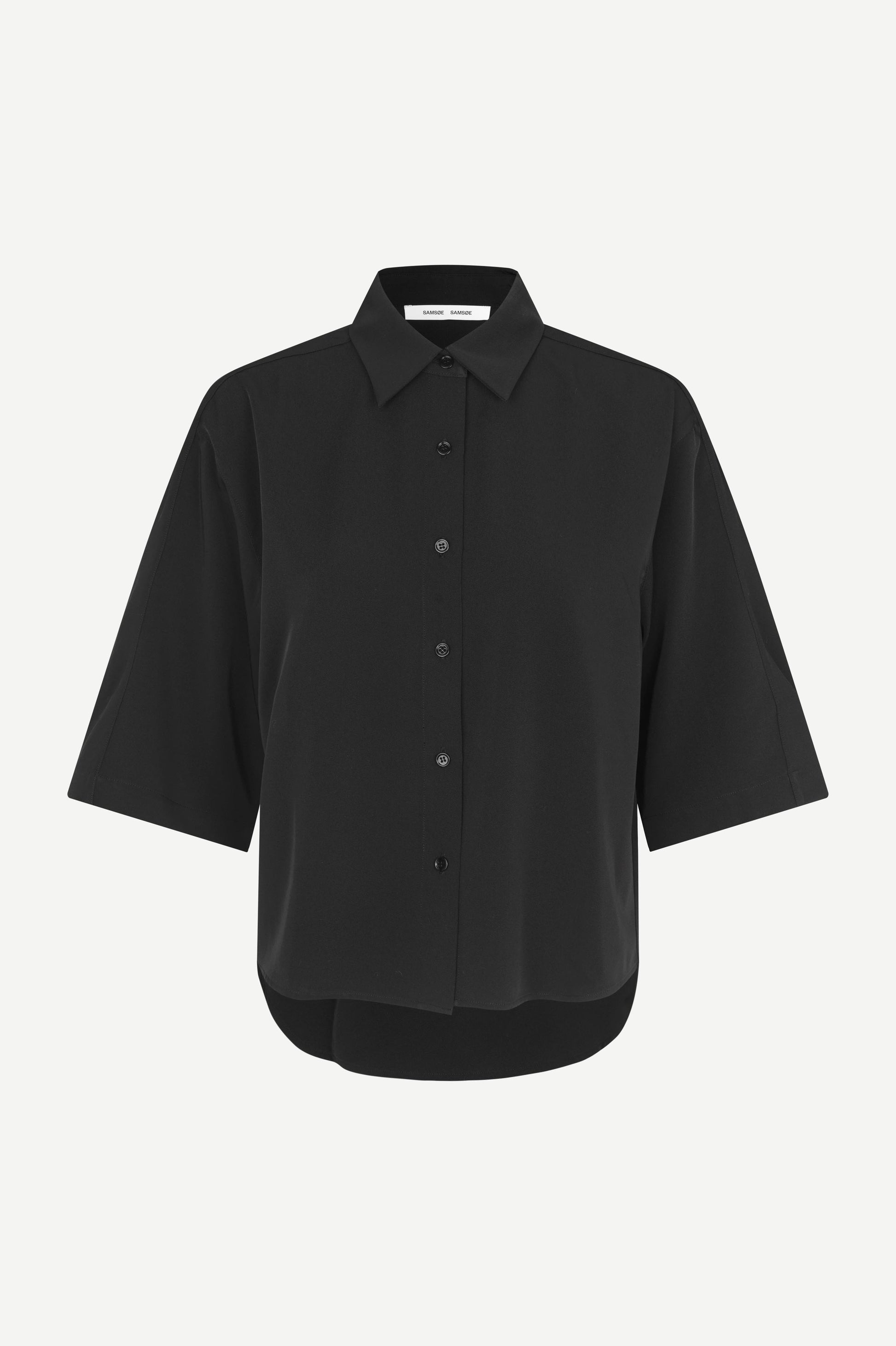 Deze zwarte blouse is gemaakt van 97% gerecycled polyester met een vleugje elastaan, waardoor de stof soepel valt en comfortabel aanvoelt. Het relaxte silhouet met halflange mouwen en klassieke kraag zorgt voor een tijdloze, minimalistische look. Draag de blouse casual met jeans of combineer als set met de bijpassende Salara Trousers voor een elegante outfit.